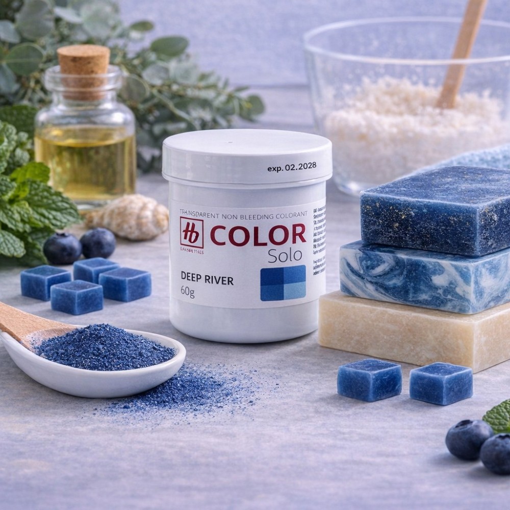 SOLO Deep River nadaje mydłom klarowne, pastelowe, a jednocześnie intensywne odcienie niebieskie, zachowując przy tym przezroczystość bazy. Barwnik nie barwi piany, nie zostawia śladów na dłoniach ani na tkaninach, co znacząco podnosi komfort użytkowania gotowego mydła.